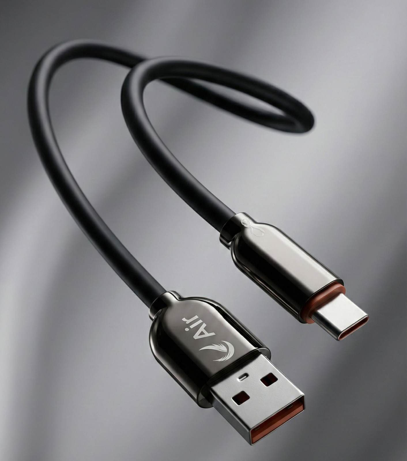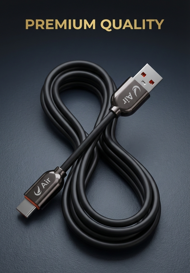 Connector Interface and Branding: The cable is configured with a standard USB-A connector on one end and a USB-C connector on the opposite end, suitable for a wide range of modern devices. The metallic housing of the USB-A plug is prominently marked with the “Air” logo and a stylized wing graphic.